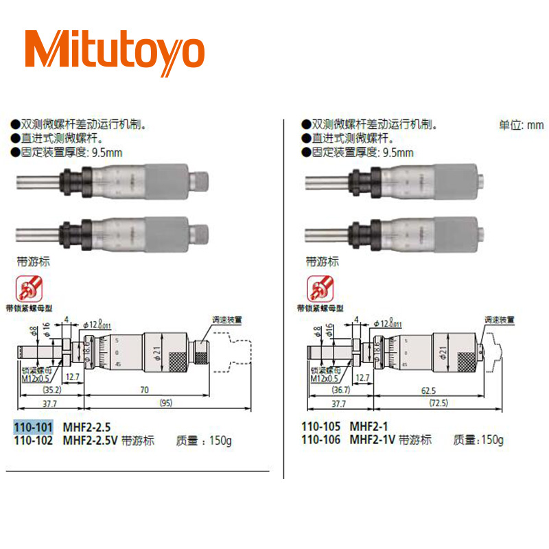 • 測(cè)微頭大直徑微分筒易于讀數(shù)(0-13mm)